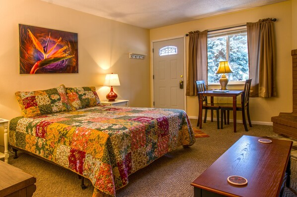 The fireplace in our room was not working, and the interior decor is dated, but clean. The room does include a space to cook, which is convenient. Television options were very limited, and DIRECTV service was hit or miss in the mountains. Any additional channels require extra payment.