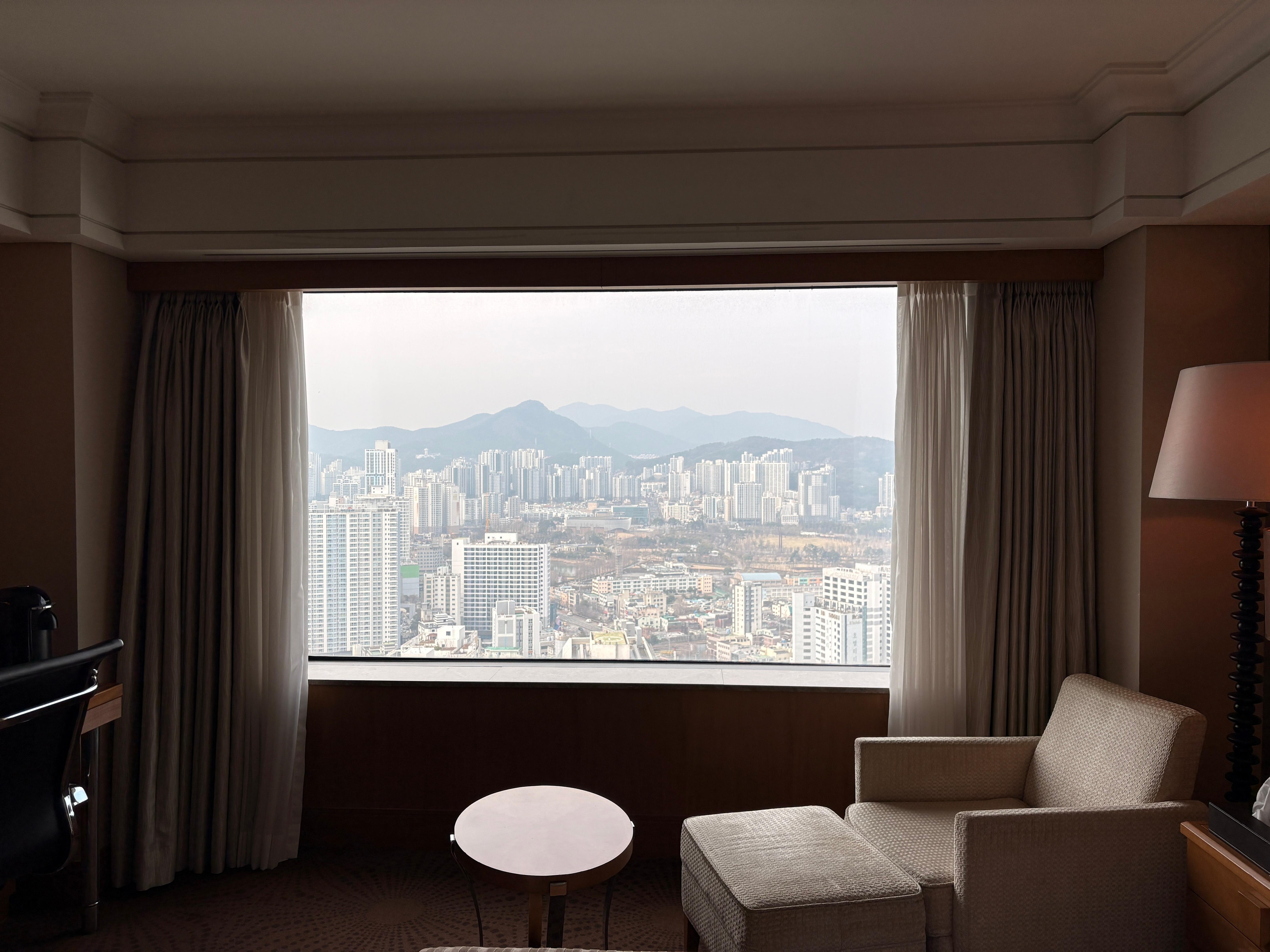 The view was amazing, the workspace was great. The over room was luxurious, spacious, great in room amenities, Nespresso, nice teas, great bed, sheets & pilows. Beautiful bathroom. The property is excellent. Highly recommend staying here. Also great location easy to get around all of Busan, 2 major train lines connected to the hotel.