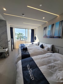 Travelers find a modern sanctuary at Bluespring Boutique Hotel near Hyeopjae Beach. The property offers practical comforts including in-room WiFi, while the lobby serves coffee and tea for guests looking to relax or gather in the available meeting spaces.