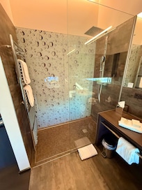 The staff was great, the room was great. My only wish is that it had a proper stand up enclosed shower. It had a bath tub with a hose and the water goes everywhere. The wonderful part is the the bathroom area has heated floors. Now I have to add this to my own home. Lots of food options nearby.
