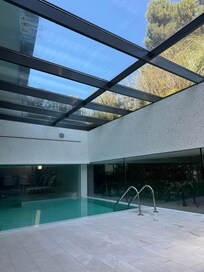 2 indoor pools and a seasonal outdoor pool, along with sunloungers and pool umbrellas