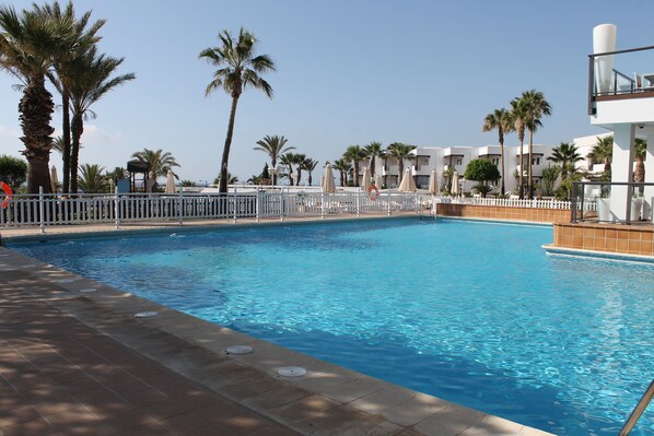 Seaside relaxation awaits at the inviting pool area with comfortable sun loungers, while guests choose between billiards indoors or playground fun outside
