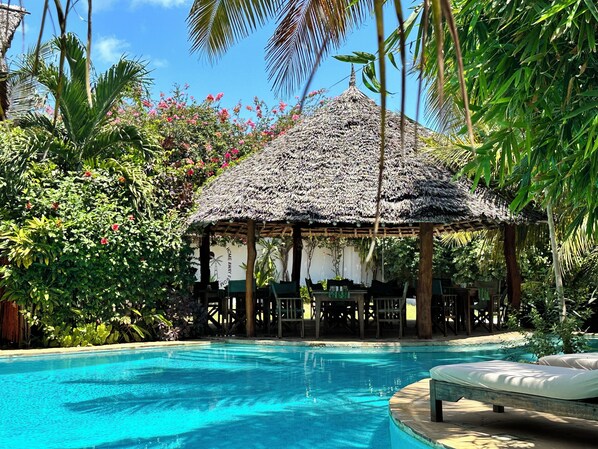 Maisha Nungwi, near Kendwa Beach, offers a tropical getaway with amenities. Enjoy coffee at the on-site shop, views from the rooftop terrace, or relax by two outdoor pools. The Aluna Garden Restaurant provides ocean views, and the staff gets consistently positive feedback.