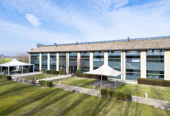 Countryside views and silence. Nothing nearby or walking distance. Isolated property outside Parma near airport. Self parking free. Very nice and modern property. Good breakfast. Rooms modern and clean. White bedding. Staff excellent. However, hallway noise level can be heard through doors. If you need silence, ask for rooms in back. Price paid was fair. Would stay again.