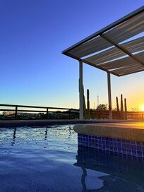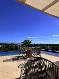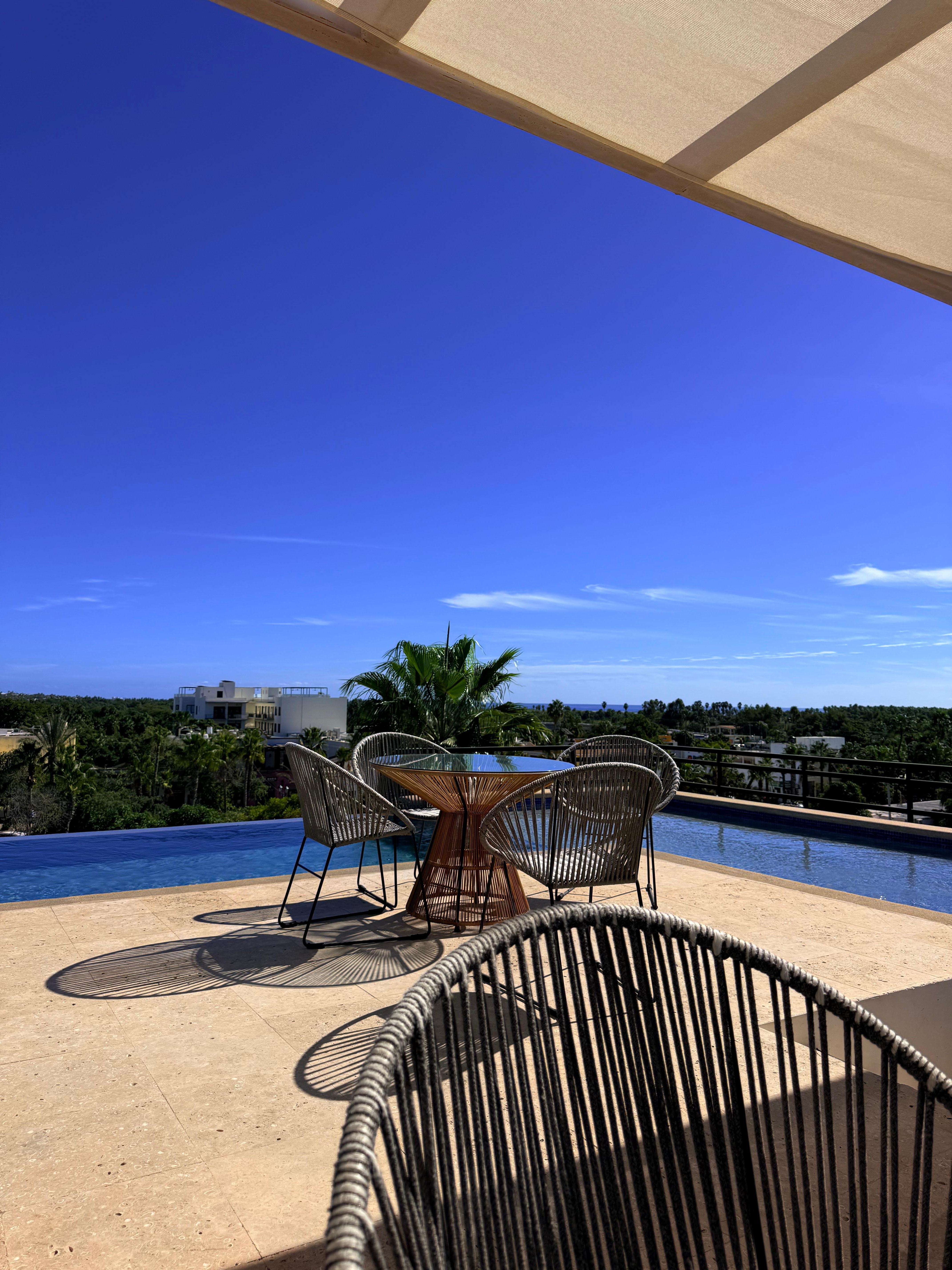 We especially enjoyed the gorgeous infinity pool. It offers great views of the iconic flag at Plaza Mijares, the main boulevard, and the lagoon — perfect for relaxing with a drink or enjoying sunset views.