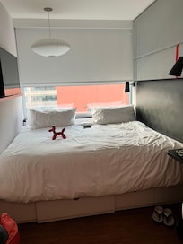 Friendly, helpful staff. Swanky bar, breakfast for a small upcharge. Great location, near all the right spots. Small, tight space once you get to the room.