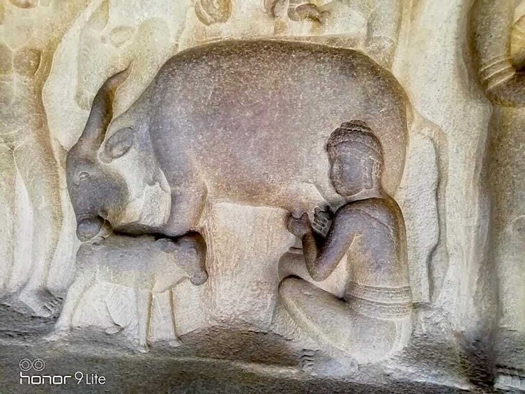 Selanjutnya dalam tur Mahabalipuram kami dari Chennai, kami mengunjungi Penebusan Dosa Arjuna, sebuah relief berukuran 100 kaki x 45 kaki di mana seluruh mahakarya dari epos Mahabharata diukir. Sungai Gangga berada di tengah-tengah panel, dikelilingi oleh makhluk-makhluk ilahi, para pemburu, hewan, burung dan pepohonan yang termasuk dalam pegunungan Himalaya. Jangan lewatkan patung kucing yang berdiri dengan satu kaki meniru orang suci sementara tikus-tikus gemuk berkumpul di sekelilingnya!