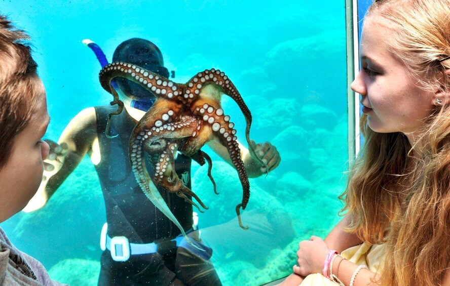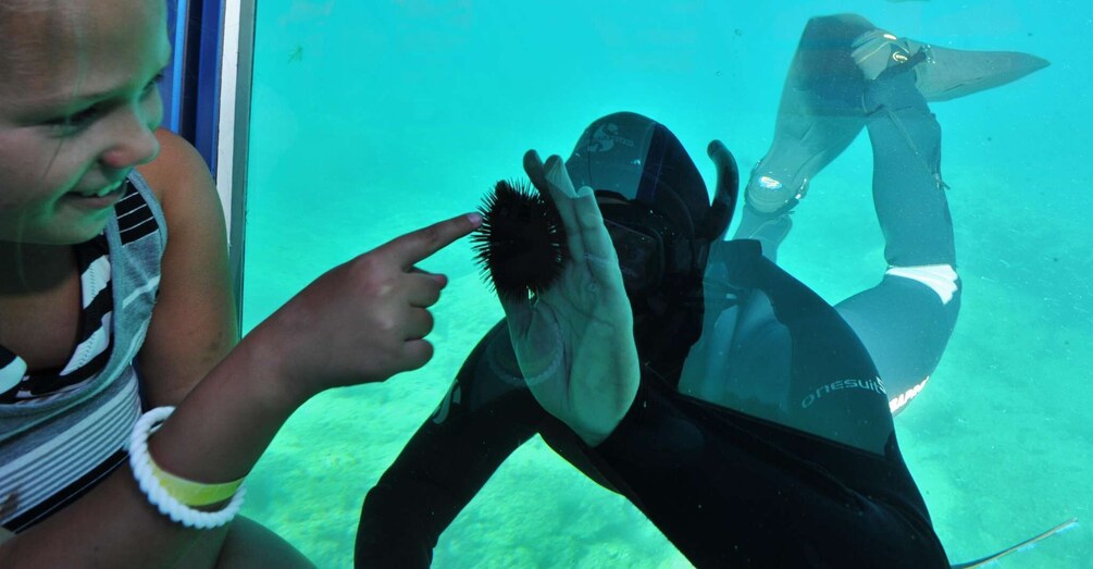 Nikmati pertunjukan menyelam dengan ratusan ikan seolah-olah di akuarium laut Anda sendiri. Saksikan saat penyelam memberi makan dan memukau ratusan ikan dengan keterampilan menyelamnya.
