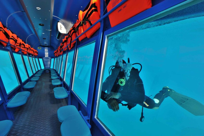 Saat Anda menaiki Yellow Submarine, Anda dapat turun ke kabin bawah laut ber-AC dan menikmati pemandangan kehidupan laut yang memukau melalui 22 jendela observatorium bawah laut raksasa. Nikmati pengalaman ini dan kagumi dunia bawah laut Laut Aegea.