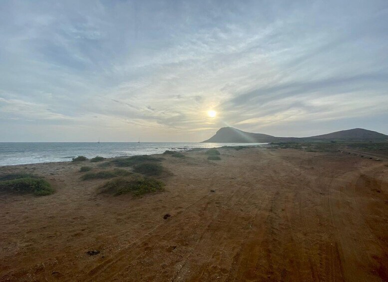 Benamkan diri Anda dalam keindahan pantai barat Pulau Sal yang mengagumkan dengan petualangan jelajah alam kami yang mengasyikkan! Dimulai pada pukul 15:00 dari Santa Maria dekat hotel Morabeza yang mewah, mulailah pendakian berpemandu di sepanjang pantai yang menakjubkan menuju Gunung Singa. Saat Anda mendaki, kagumi matahari terbenam yang menakjubkan yang melukis langit dengan warna-warna cerah.