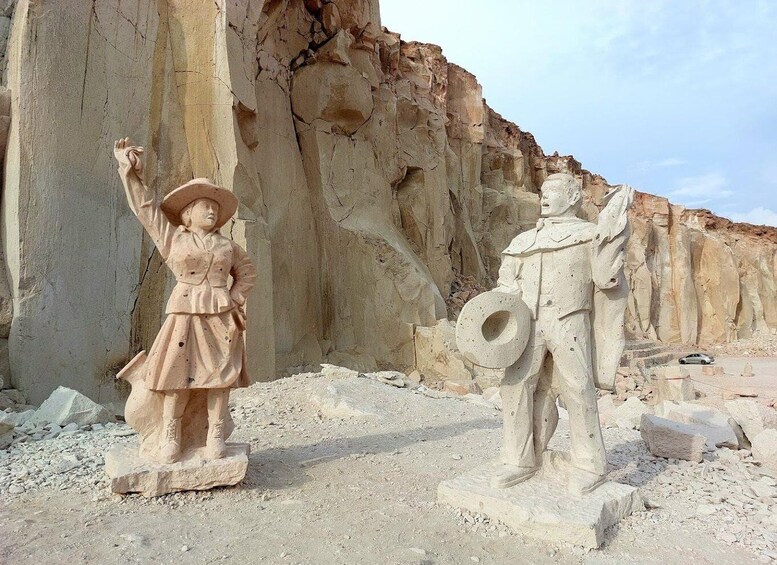 The next stop, now focusing on the Sillar Route, where we will stop is the Añashuayco Quarry; which we will reach in approximately 45 minutes. It is currently in operation, the stonemasons do their work very early; At the site, you can see a huge canyon with cliffs (ignimbrite walls) several metres high, formed by the extraction for the formation of the Sillares. At this point, we will tell you the history of the sillar, its production, and the use that has always been given to it. In this quarry, you can see a Mega carving of the Church of the Company of Jesus made by the stonemasons themselves. We can also visit one of them so that they can explain to us how their daily work is and make us experience cutting one of their stone blocks ourselves.