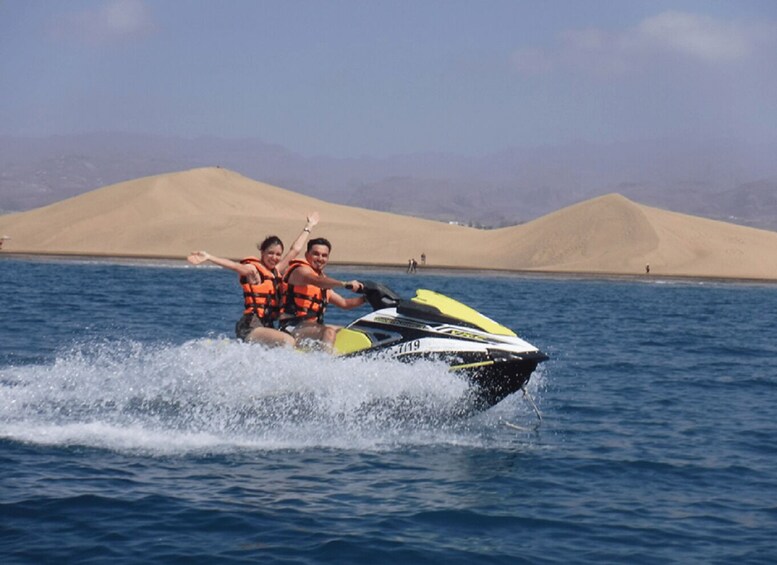 Pengalaman jet ski selama 30 menit hanya di sirkuit di Playa del Ingles (tidak memungkinkan untuk pergi ke luar sirkuit) dapat diminta dan dibayar dengan biaya tambahan (1 jet ski x 1 atau 2 orang = 90 €) di toko hanya jika kondisi cuaca, kondisi laut, dan angin memungkinkan. Sebaliknya, jika cuaca buruk, Anda dapat memilih untuk melakukan jet ski di hari lain.