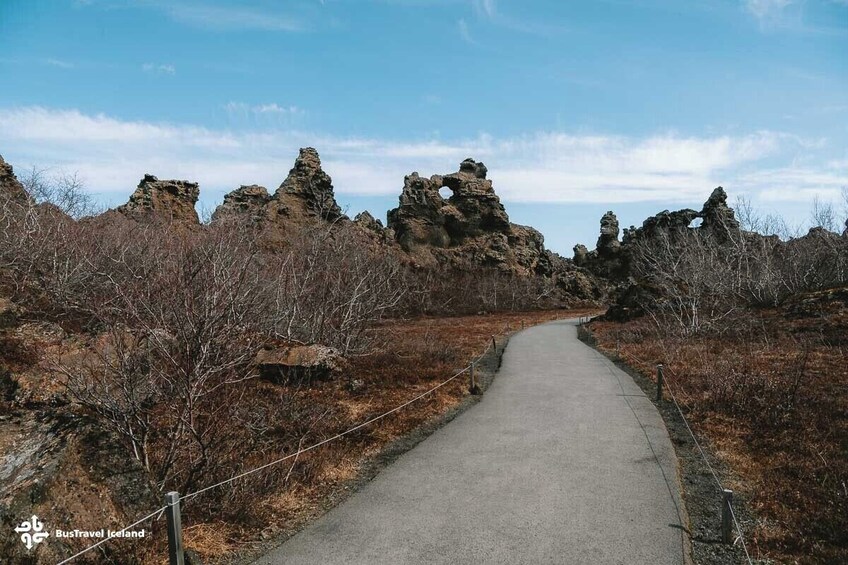 Kemudian melangkahlah ke dunia surealis Dimmuborgir, di mana pilar-pilar lava yang menjulang tinggi, gua-gua, dan lengkungan-lengkungan membentuk lanskap yang dramatis dan nyaris seperti mitos.