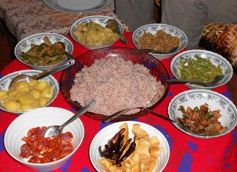 Setelah petualangan minum teh Anda, masuklah ke dapur lokal yang hangat untuk merasakan pengalaman memasak khas Sri Lanka bersama Fathima, seorang juru masak rumahan yang terkenal dengan keramahannya. Dengan menggunakan sayuran segar, rempah-rempah aromatik, dan kelapa, Anda akan belajar cara menyiapkan hidangan nasi dan kari tradisional Sri Lanka - lima hidangan lezat yang dibuat dengan cara yang otentik.