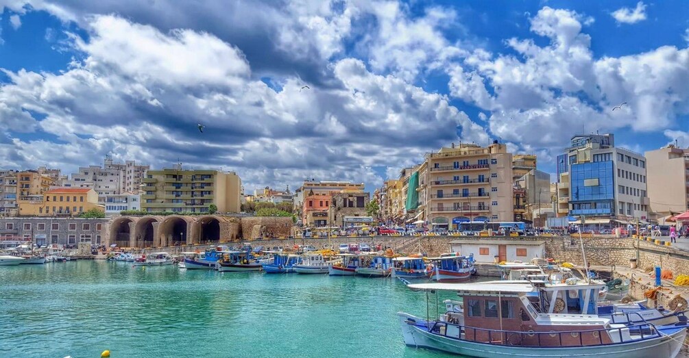 Lanjutkan ke pusat keramaian Heraklion, ibu kota Kreta. Bergabunglah dengan Tur berjalan kaki singkat di area bersejarah dan kemudian nikmati waktu luang untuk berbelanja di pasar tua, menjelajahi pelabuhan Venesia, bersantai di kafe, atau mengunjungi Museum Arkeologi.