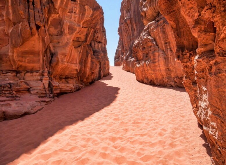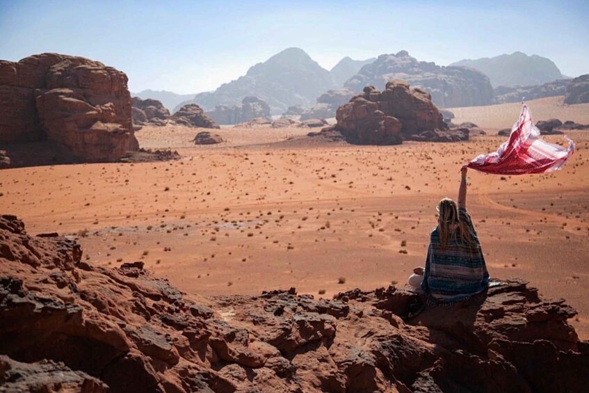 Once you’re ready, the tour sets off into the heart of the desert. You’ll explore some of Wadi Rum’s most iconic landmarks, including Lawrence Spring, the sweeping Red Sand Dune, the narrow walls of Khazali Canyon, the Little Arch, Lawrence’s House, Mushroom Rock, Jabal Burdah, Abu Khashaba Canyon, and the striking Um Frouth rock bridge.