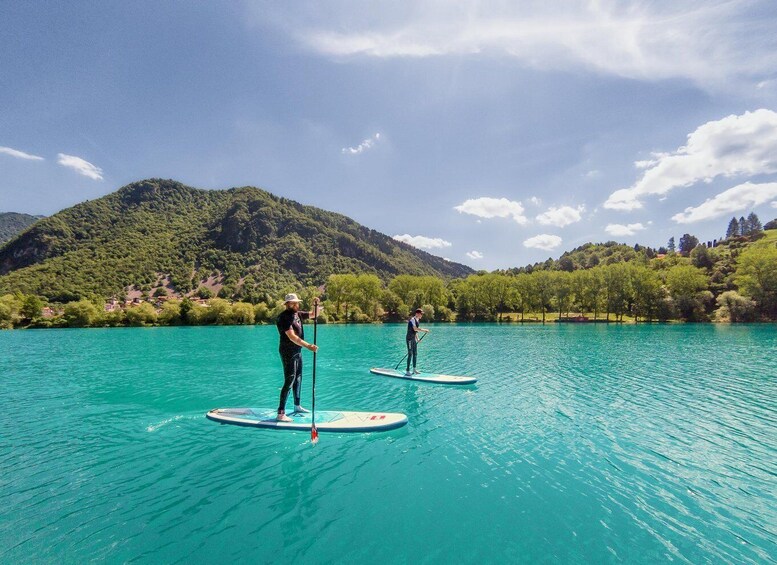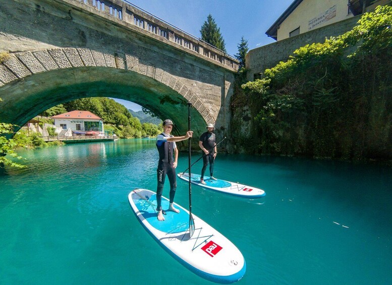 When we are all comfortable on our boards, we will start our journey across the lake and into the mesmerising Idrijščica canyon.