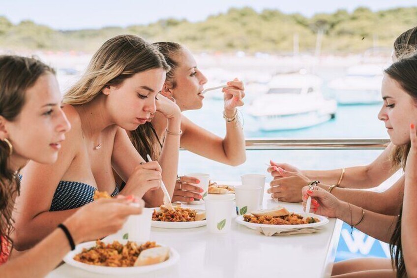 - We do not have an option for paella. For clients with intolerances they can bring their own food on board. The fact of not consuming the paella does not give the right to a discount on the amount of the tickets.