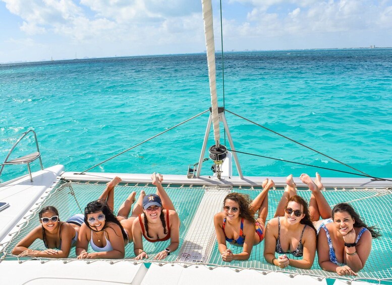 Enjoy an unforgettable experience sailing on a catamaran over the blue of the Mexican Caribbean, with an incredible view of Isla Mujeres that will leave you amazed, as you immerse yourself in its crystal clear waters and snorkel where you will see a great variety of marine animals On Isla Mujeres, we will take you to our club where you will have time to enjoy a buffet lunch, open bar, and relax in front of the ocean. Also, you will have free time to walk through the centre of the island, take pictures of yourself in the monuments or buy souvenirs. At the time of returning to our marina in Cancun, the trip will last 1 hour which you can continue enjoying the open bar, you will have the best view to see the sun hiding under the sea in a beautiful sunset and will be able to challenge yourself doing the spinnaker that will raise you up to Heights. music and a party guided by our great staff await you