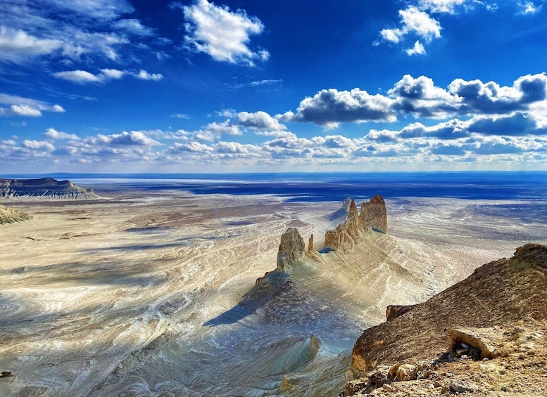 Then, head to the legendary Karynzharyk Depression, a surreal salt desert dominated by three isolated rock formations known as the “Three Batyrs.” This place is often described as one of the most otherworldly landscapes in Kazakhstan.