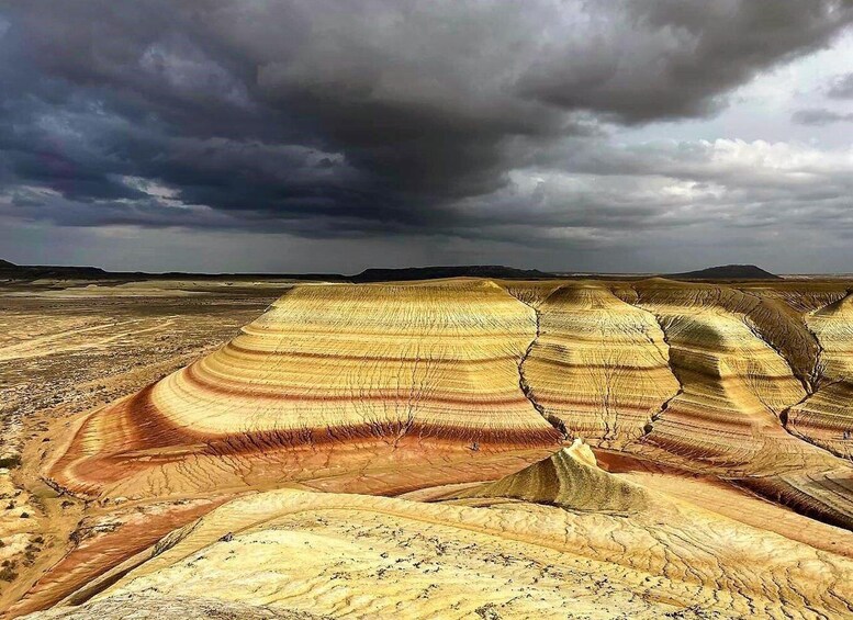 Continue towards the colourful hills of Kyzylkup, famous for its layered red, white, and pink clays. Often compared to a giant “Tiramisu,” these formations preserve traces of the ancient Tethys Ocean that once covered this land. Each layer tells a storey millions of years old.