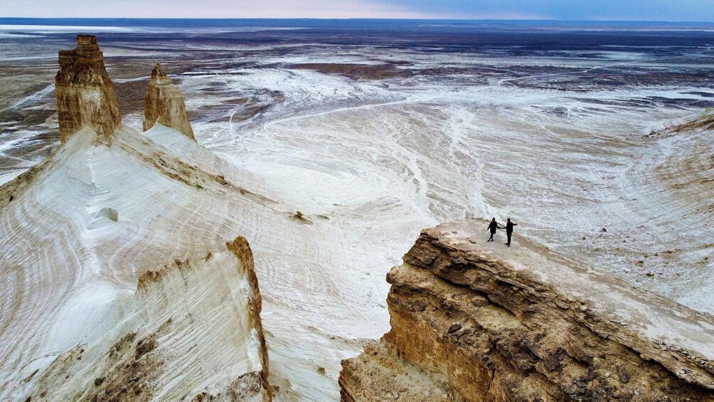 The first highlight is the Karagiye Depression, one of the deepest land depressions in the world. Surrounded by steep white cliffs and endless salt flats, this immense natural basin creates a feeling of absolute scale and isolation.