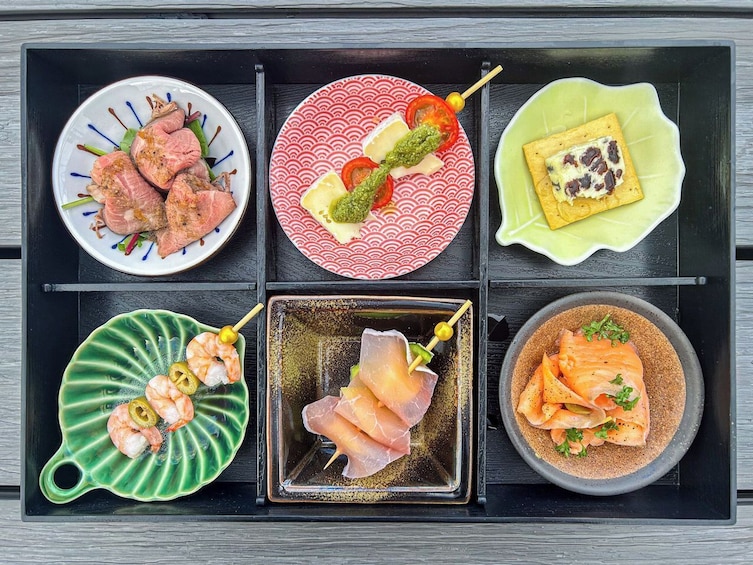 - 6 jenis makanan pembuka “otsumami” (hidangan kecil): daging sapi panggang, salmon asap, tomat dan camembert pinchos, udang koktail, mentega kismis, prosciutto dengan melon