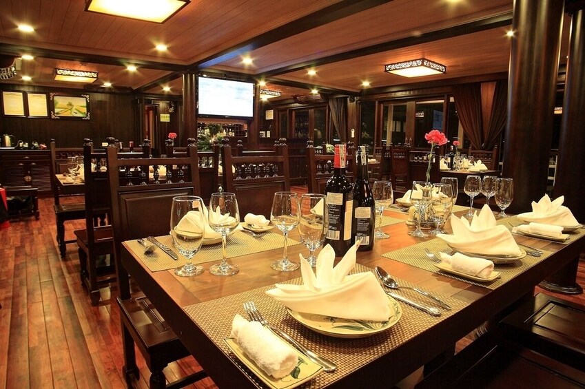 - Hidangan di atas kapal adalah perpaduan: Vietnam, hidangan laut & internasional. Para tamu harus memberi tahu kami tentang preferensi makanan khusus, alergi, atau persyaratan diet apa pun setidaknya 3 hari sebelum tanggal keberangkatan