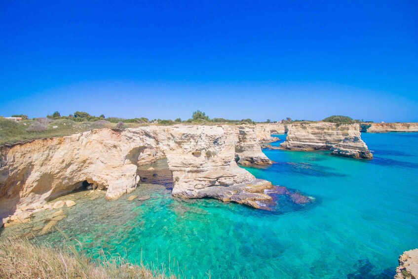 Descending along the Adriatic coast, our next stop is Torre dell'Orso, home to Le Due Sorelle, two twin rocks steeped in legend. According to folklore, these rocks represent young women who tragically drowned and were transformed into stone by the gods. Torre Sant'Andrea follows, boasting awe-inspiring sandstone stacks sculpted by wind and sea over centuries.